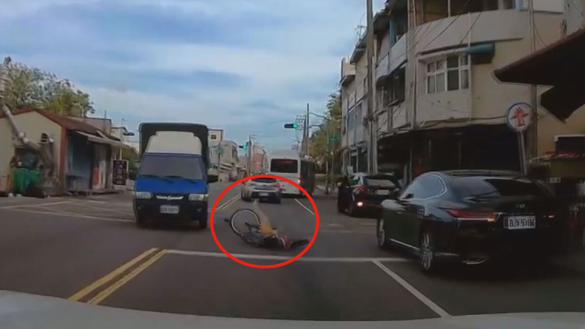 行車紀錄器顯示,男童騎乘自行車(紅圈處)疑似未依規定左轉時,與直行小貨車發生碰撞,男童噴飛倒地。所幸送醫檢查後並無大礙。(記者李佳龍/翻攝自鼓山分局)