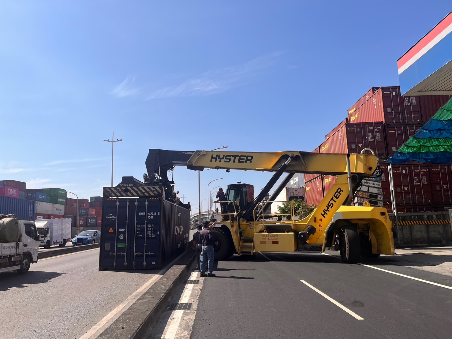 本(4月21日)日下午3時許,前鎮分局草衙出所接獲報案,表示在草衙與金福路口發生一起貨櫃曳引車妨害交通的事件。接獲報案後,警方迅速趕往現場進行管制,並防止交通事故發生。經查,該貨櫃曳引車因所載貨櫃不明原因傾倒,影響了通行秩序。