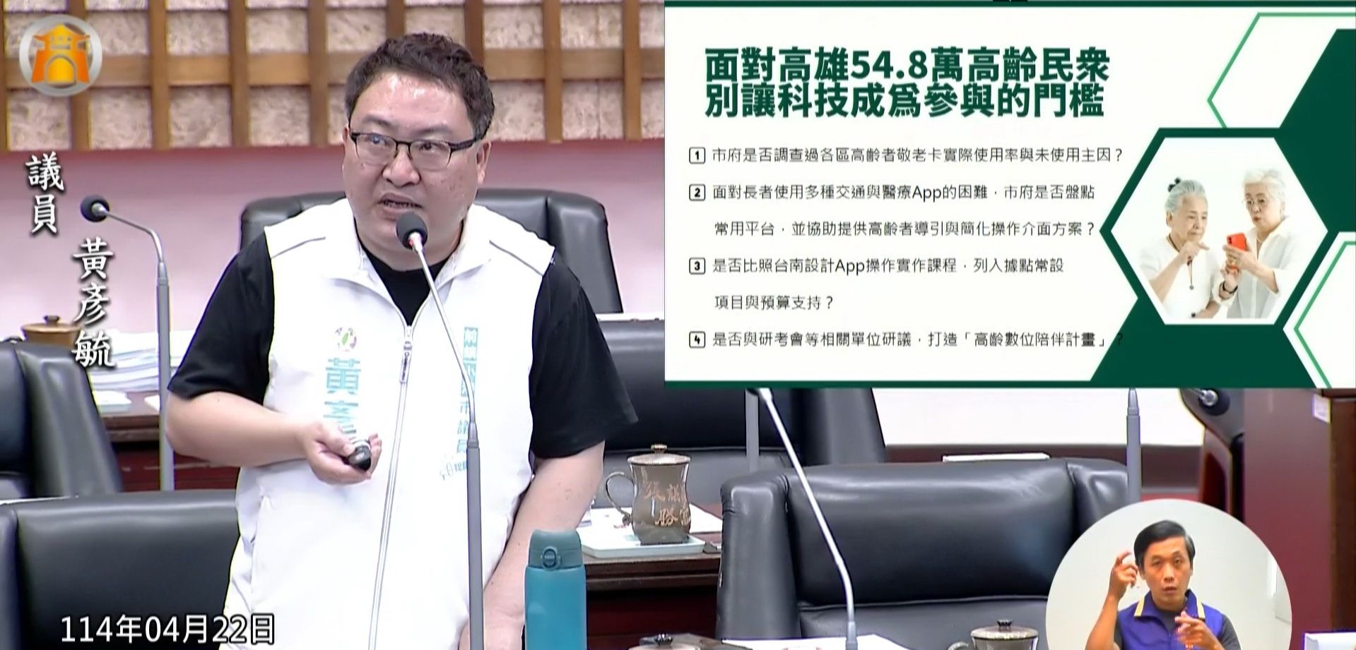 除了輪椅兒童交通問題,黃彥毓也關注市政數位化對高齡者造成的服務落差。他指出,不少長輩反映不會使用App,導致敬老卡搭乘、醫療服務、福利查詢等流程無法順利進行,數位化反而成為排除門檻。他建議社會局應與據點合作,常態性開設App操作實作課程,並設計高齡友善介面與現場陪伴協助機制,讓市政服務不因數位差距而中斷。