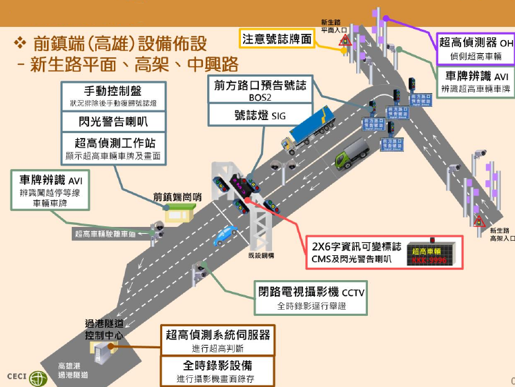 此系統於隧道兩端之「超高車駛離車道」前150m~400m不等,設置光達式偵測掃描器及車牌辨識AI系統,在偵測超高車輛時,搭配(1)閃光警告喇叭提高用路人注意、(2)新設紅燈警示號誌管制車流、(3)資訊可變號誌(CMS)顯示超高車輛違規事件,告知用路人隧道管制通行並顯示違規車輛車牌,後續車流停止後由隧道兩端常駐保全人員,引導超高車輛駛離車道並交付港警後續處理。