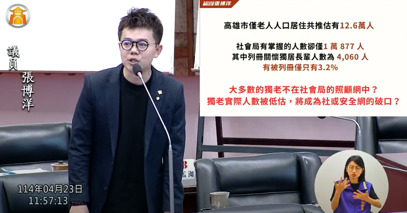 【記者陳春生/高雄報導】高雄市議員張博洋指出,隨著人口高齡化加劇,高雄市的獨居長者數量也在持續攀升。今年初高雄發生的重大連環分屍案,其中兇嫌和被害人都是獨居長者,不僅震驚社會,更揭露出獨居長者在高度孤立下所面臨的潛在風險與社會支持不足的困境。無論是身心健康、生活照護,甚至人身安全,皆已成為高風險族群。政府的社會安全網也未隨之健全,恐已出現重大漏洞,亟需正視與補強。