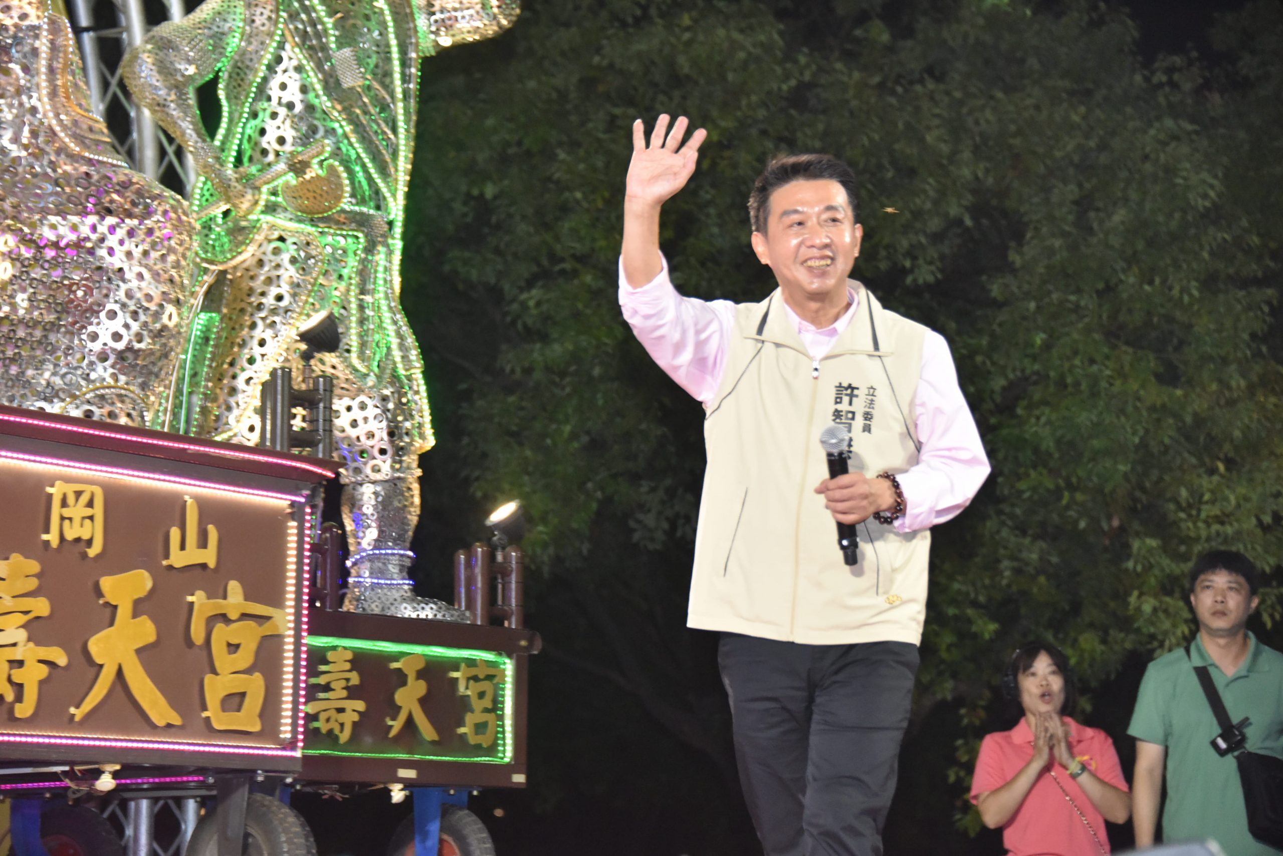 許智傑表示,感謝壽天宮廟方的支持與協助,讓這場活動能夠順利舉辦,前幾天天氣高溫炎熱本來有點擔心,還好今天轉涼適合舒適地聽歌看表演,可以給岡山鄉親們一個難忘的夜晚。
