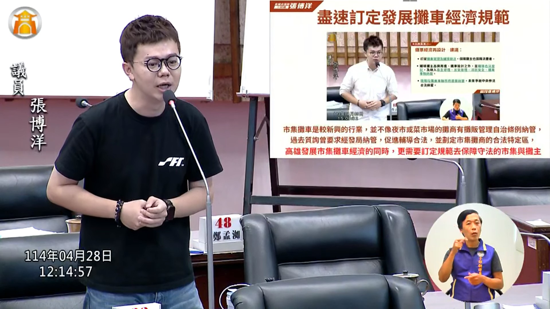 張博洋強調,市集攤車作為新興經濟型態,必須建立完善的管理機制。他指出,傳統夜市、菜市場已有自治條例規範,但新型態攤商尚無明確管理依據,容易產生管理漏洞。要求經發局必須積極推動攤商納管,輔導合法化,並劃設合法特定區域,以確保攤車市集產業能有序發展。保障守法經營者的權益,打造公平競爭環境,才能讓高雄觀光產業持續升級,展現國際級城市的專業形象!
