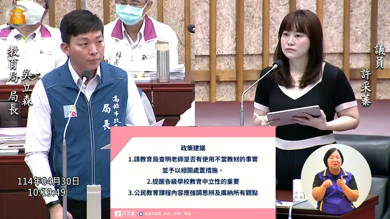 許采蓁批國小教材不當 高市教育局回應將調查並強調教學中立