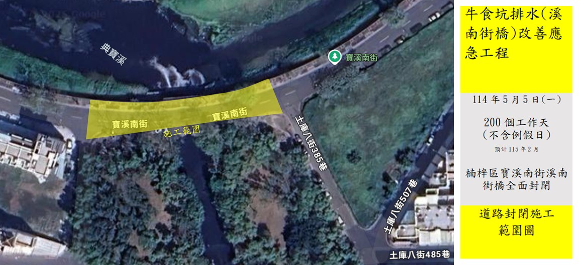 工務局表示,牛食坑排水(溪南街橋)改善應急工程,工區範圍位於寶溪南街範圍內之溪南街橋,採「全面封閉」方式施工,希望加速工程進度,對於影響民眾不便時間降到最低。