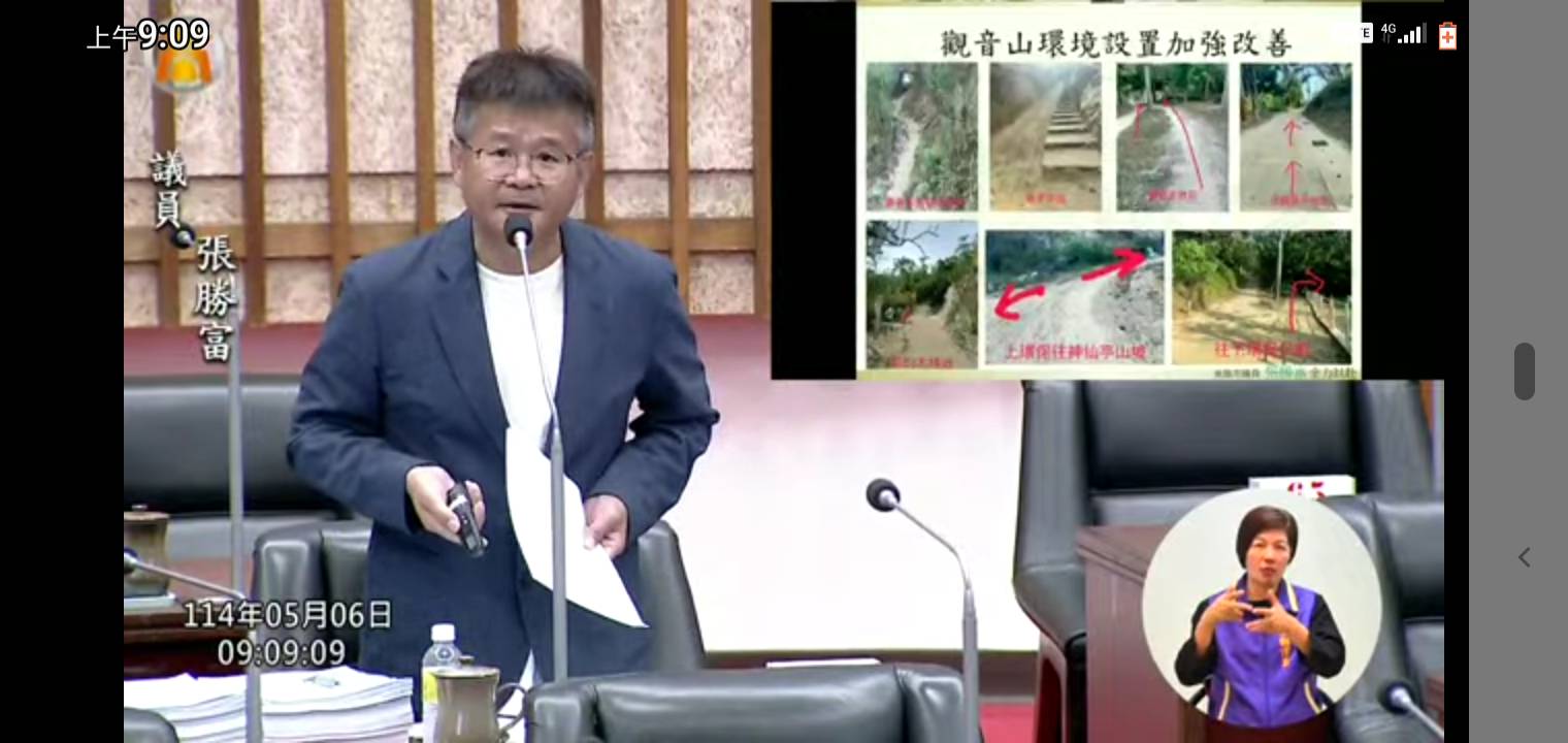 張勝富議員總質詢指出,觀音山、觀音湖是南台灣知名觀光景點,假日吸引大批登山健身及逛市集遊客,卻因木棧道及植栽設施嚴重不足,導致沿途步道塵土飛揚、雨天泥濘不堪,更應清理雜草及補充植栽及友善公廁等,加上觀音山、湖未來能有步道銜接串連,打造觀音山風景區全新風貌。