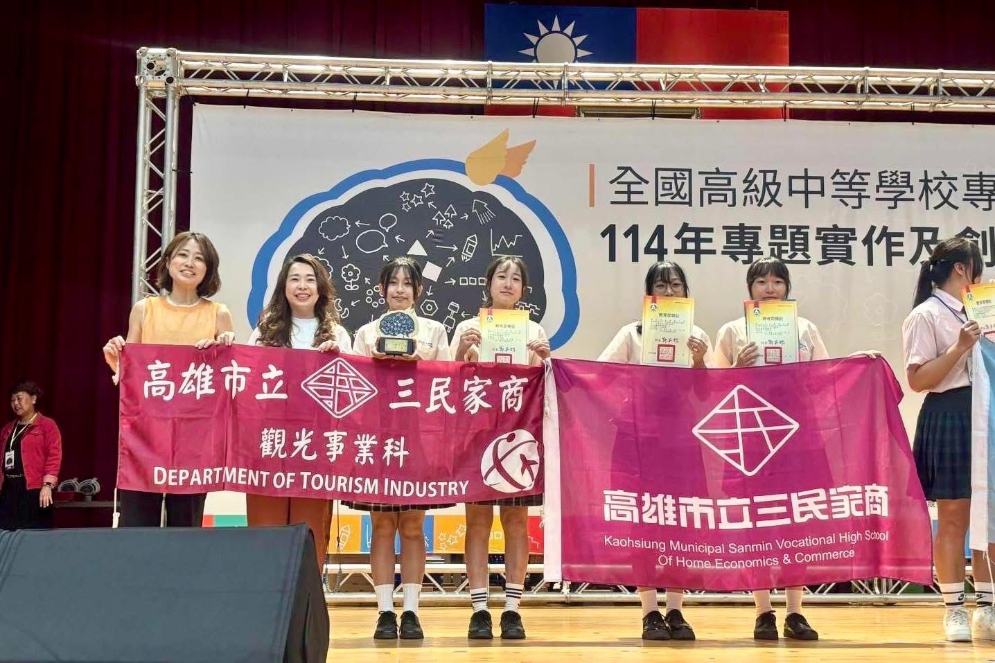 全國專題製作於今年5月2日至4日在臺灣師範大學舉行,三民家商觀光科已經是連續10年都獲獎,其中觀光科更是榮獲7次冠軍技冠全國,幼保科連續7年都獲獎2次勇奪國冠軍,今年觀光科在全國一百多個團隊參賽,經過評比後有28個團隊脫穎而出,三民家商觀光科最後擊敗群雄奪得全國第一名,再度展現卓越創意與跨域整合實力。