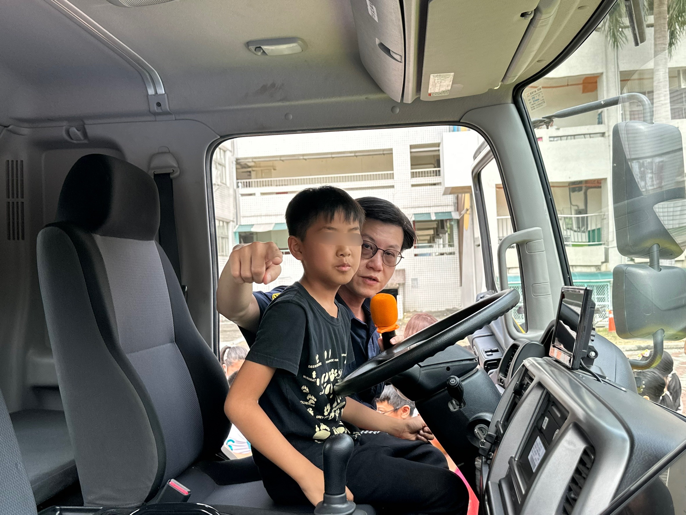 活動中,學童們輪流登上大型貨車的駕駛座,從司機的視角觀察周遭環境,親身體驗視野受限的範圍。許多學童在體驗後都驚呼,大型車的視野死角「真的很大、真的看不到」,深刻體會到大型車駕駛在行駛時的視線盲區。