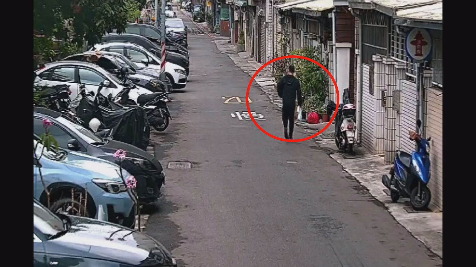 從監視器畫面中看到,身穿深色衣褲的黃嫌(紅圈處),正前往被害人王姓男子租屋處的影像。(記者李佳龍/翻攝自高市警苓雅分局)