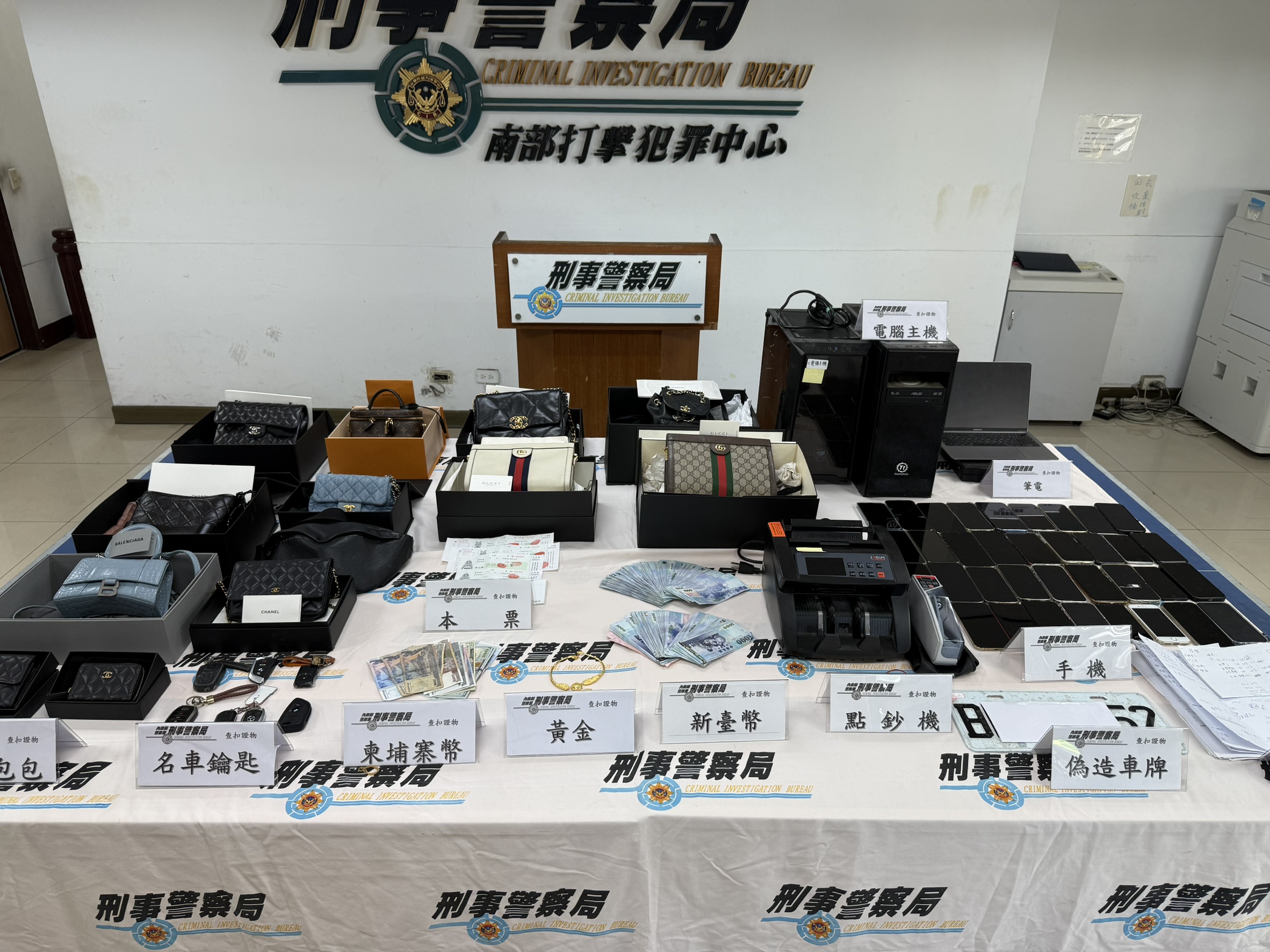 警方查扣詐團詐騙贓證物擺滿桌面,包含多個名牌包、現金、黃金項鍊、金融卡及點鈔機。(記者李佳龍/翻攝)