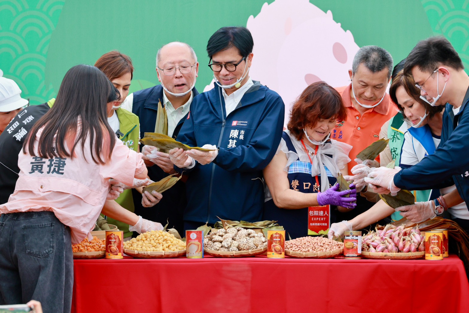 市長陳其邁出席「三鳳慶端午 和風粽飄香」百人封街包粽活動,親自動手體驗包粽樂趣。(記者翻攝)