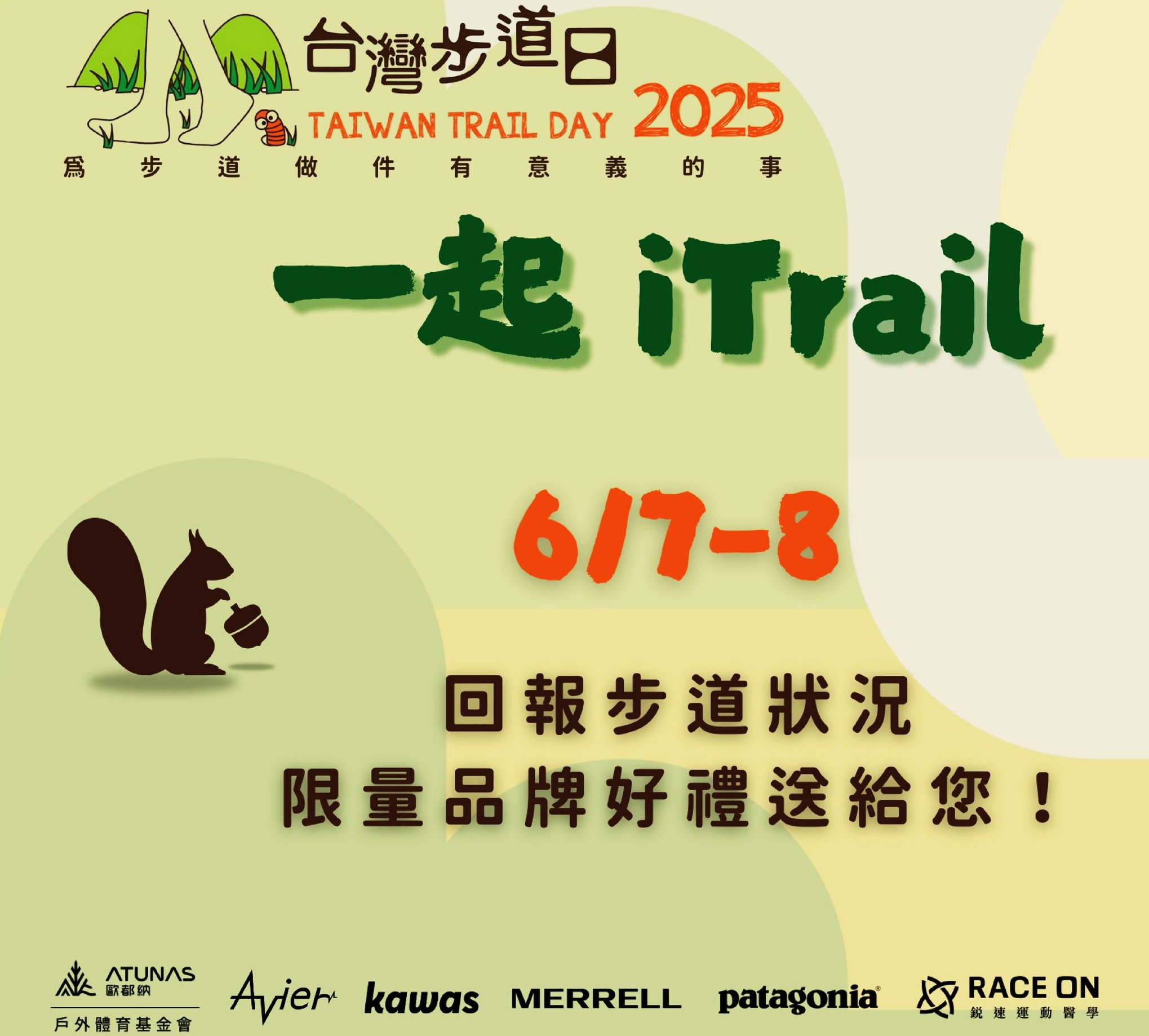 每回報「3筆有效資料」即可獲得一次抽獎機會,分享僅需一次,須將分享對象設為公開,分享您的步道行動,讓更多人一起關心環境。抽獎內容:多家知名戶外用品品牌之戶外用品,敬請期待!合作品牌:Avier、kawas、MERRELL、Patagonia、Race on、XTERRA、歐都納。