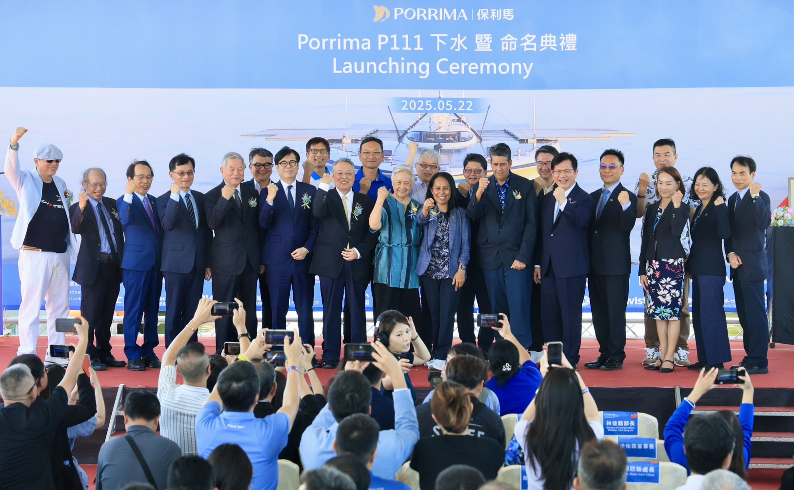 高雄市長陳其邁今(22)日出席「保利馬1號」(Porrima P111 )下水典禮,肯定該船為全球首艘淨零碳排船舶,展現臺灣在永續與綠色科技領域的領先實力,並與施振榮創辦人、帛琉惠恕仁總統、外交部林佳龍部長等貴賓共同參與命名揭牌及致贈船模儀式,見證我國航向海洋永續新里程的重要時刻。