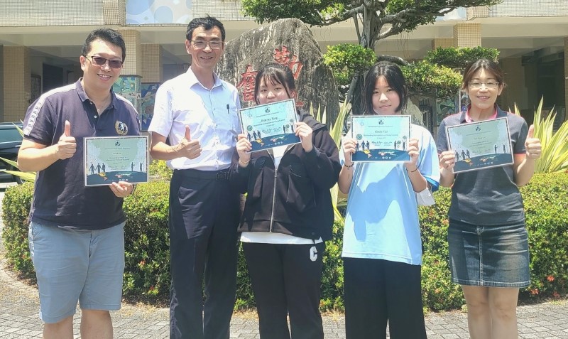 左1:指導老師劉育宏,左2:蘇清山校長,中:楊忻燕同學,右2:蔡可芯同學,右1:指導老師林澔萍。(記者翻攝)