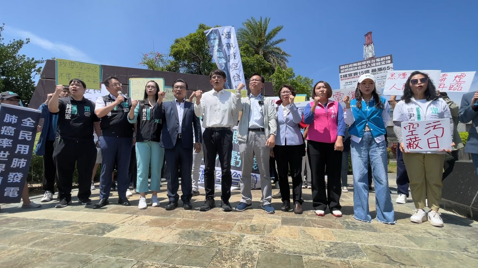 「全民用肺發電」布條高舉,藍白民代齊聲反對興達燃煤機組持續備轉啟用,要求中央落實除役承諾,保障市民健康。(記者李佳龍/攝)