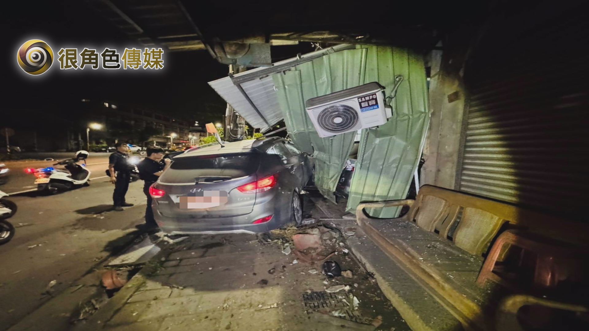 車輛猛烈撞擊民宅下,連空調外機都遭撞擊移位,警調查駕駛林男是否毒駕上路。(記者李佳龍/翻攝)