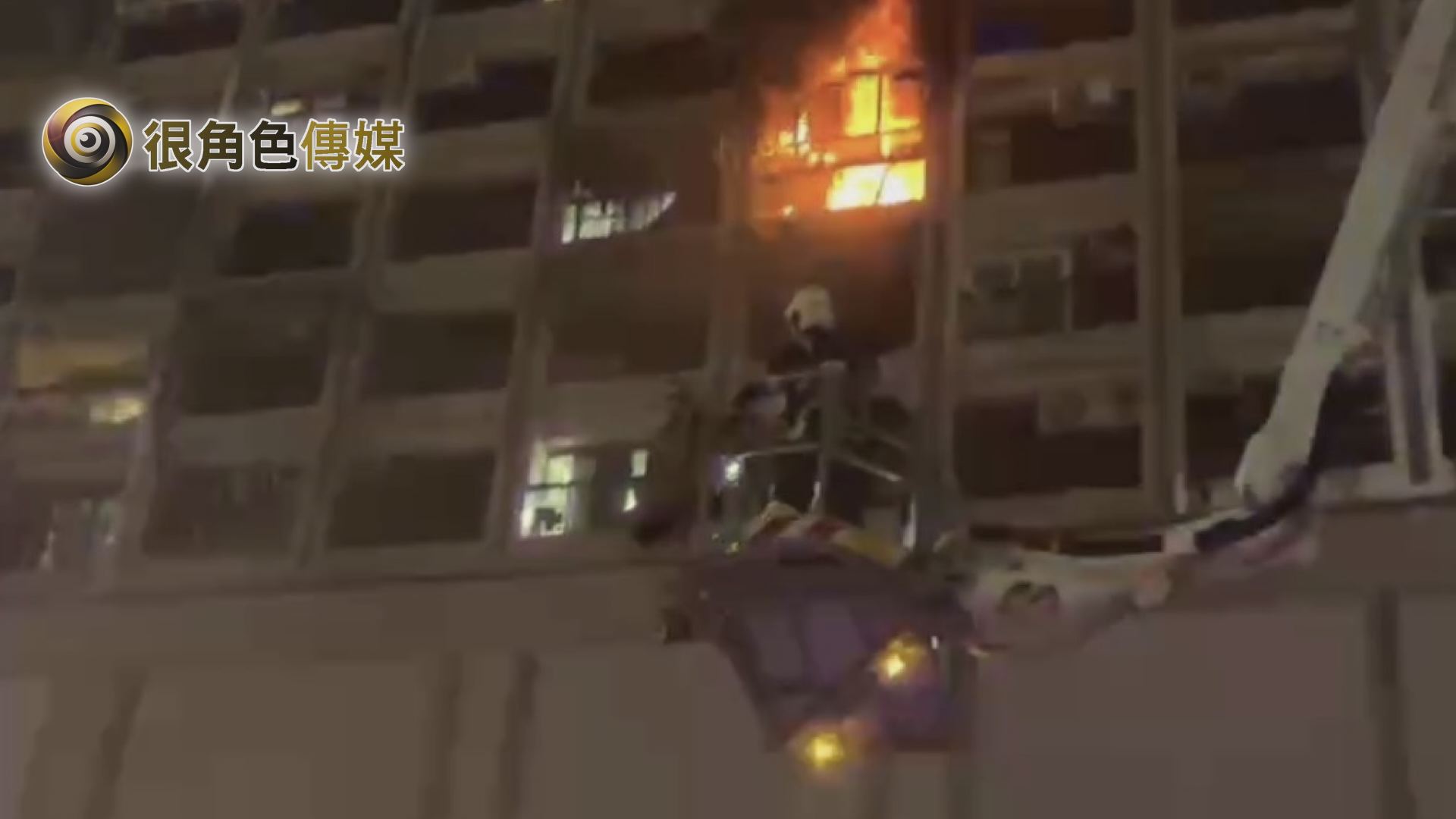 消防隊員操作雲梯車對高雄七賢大樓火警進行灌救,所幸無人傷亡。(記者李佳龍/翻攝)