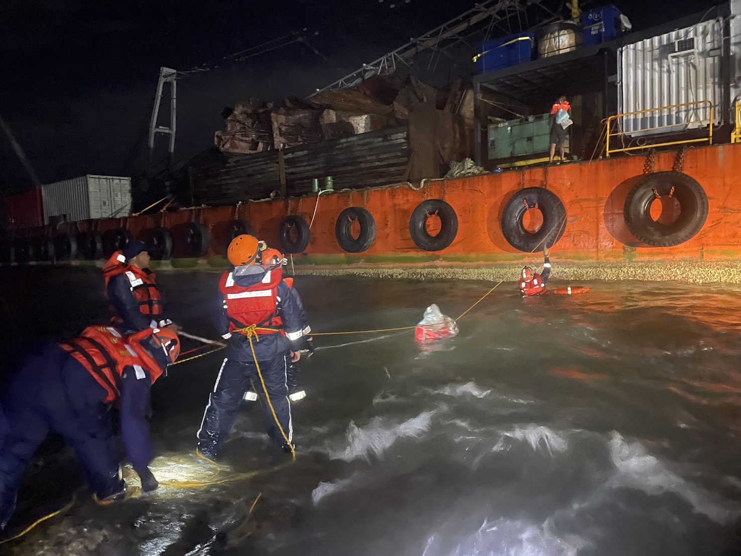 第六岸巡隊接獲通知後,立即派遣救援人員冒雨前往現場。當時正值強降雨、能見度低的惡劣天候,救援人員徒步攀爬礁岩,利用捲線延伸式浮水繩實施下水救援,逐一將4名台籍船員安全接駁至岸邊,全程驚險但無人傷亡。