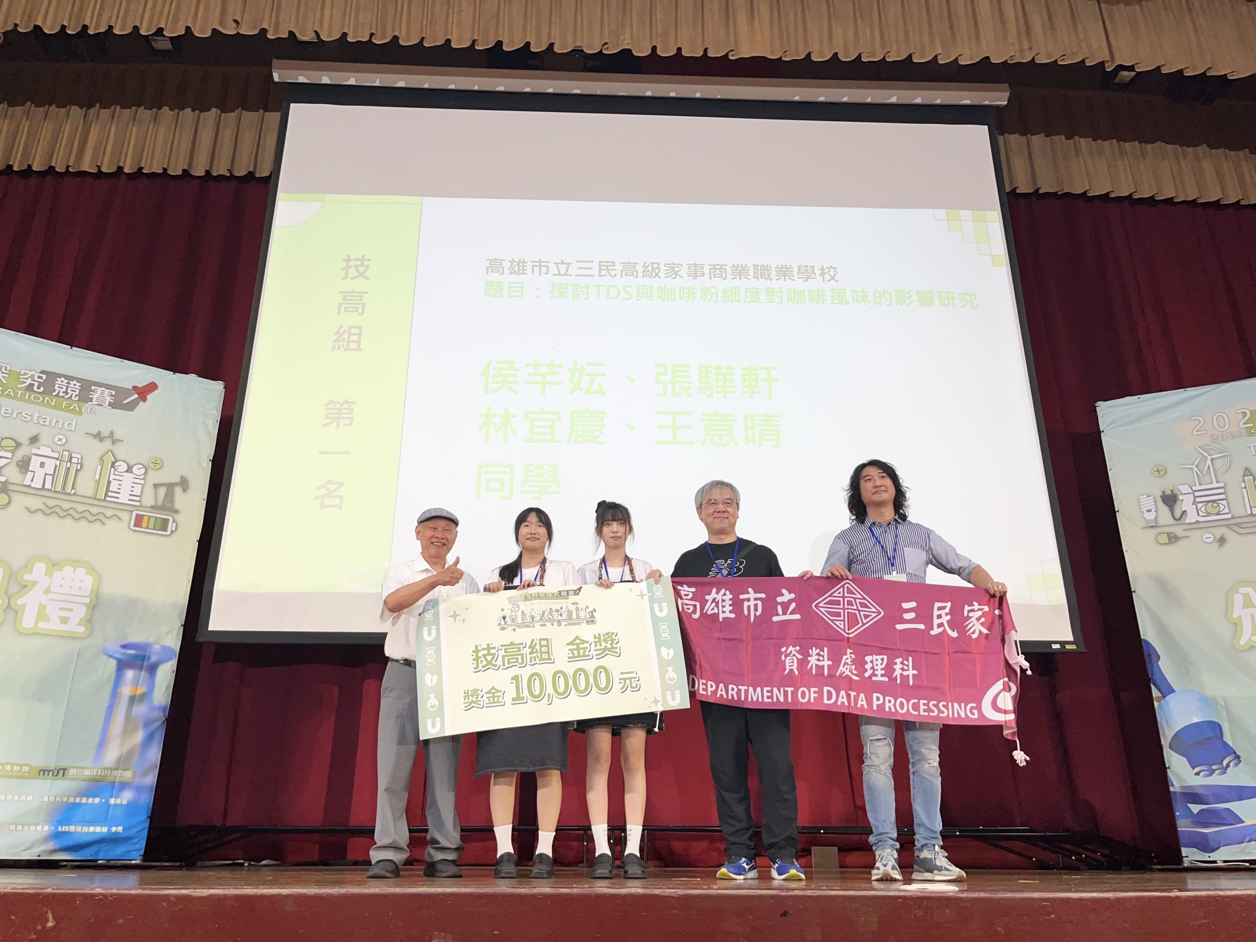 此外,三民家商也以研究主題「探討TDS與咖啡粉細度對咖啡風味的影響研究」,符合探究競賽研究主題嚴謹、多元豐富,在技高組參賽競爭激烈勝出,勇奪金牌。參賽學生侯芊妘、張驊軒、林宜慶、王意晴。指導老師張聖雍、王冠傑。