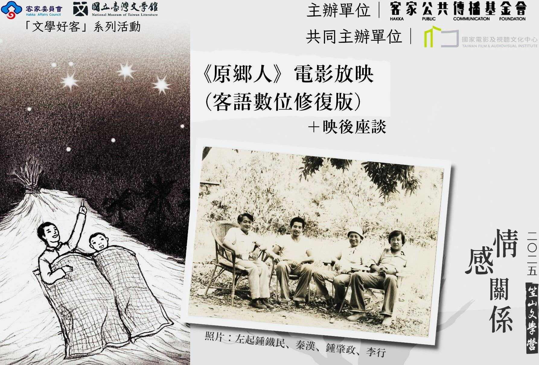 客家公共傳播基金會委託國家電影及視聽文化中心完成《原鄉人》數位修復,並恢復美濃腔客語配音,在鍾理和紀念館完成戶外放映,不少美濃鄉親前來觀賞,反應熱烈,可惜的是《原鄉人》恢復客語配音其背後的思考脈絡,和配音時遇到的種種難題,沒有機會在映後細談,因此去年底鍾理和文教基金會便想再度邀映《原鄉人》,獲得客傳會應允,鍾理和基金會並加碼邀請客傳會陳板董事長,及《原鄉人》客語配音領班宋菁玲老師,進行100分鐘的映後座談。
