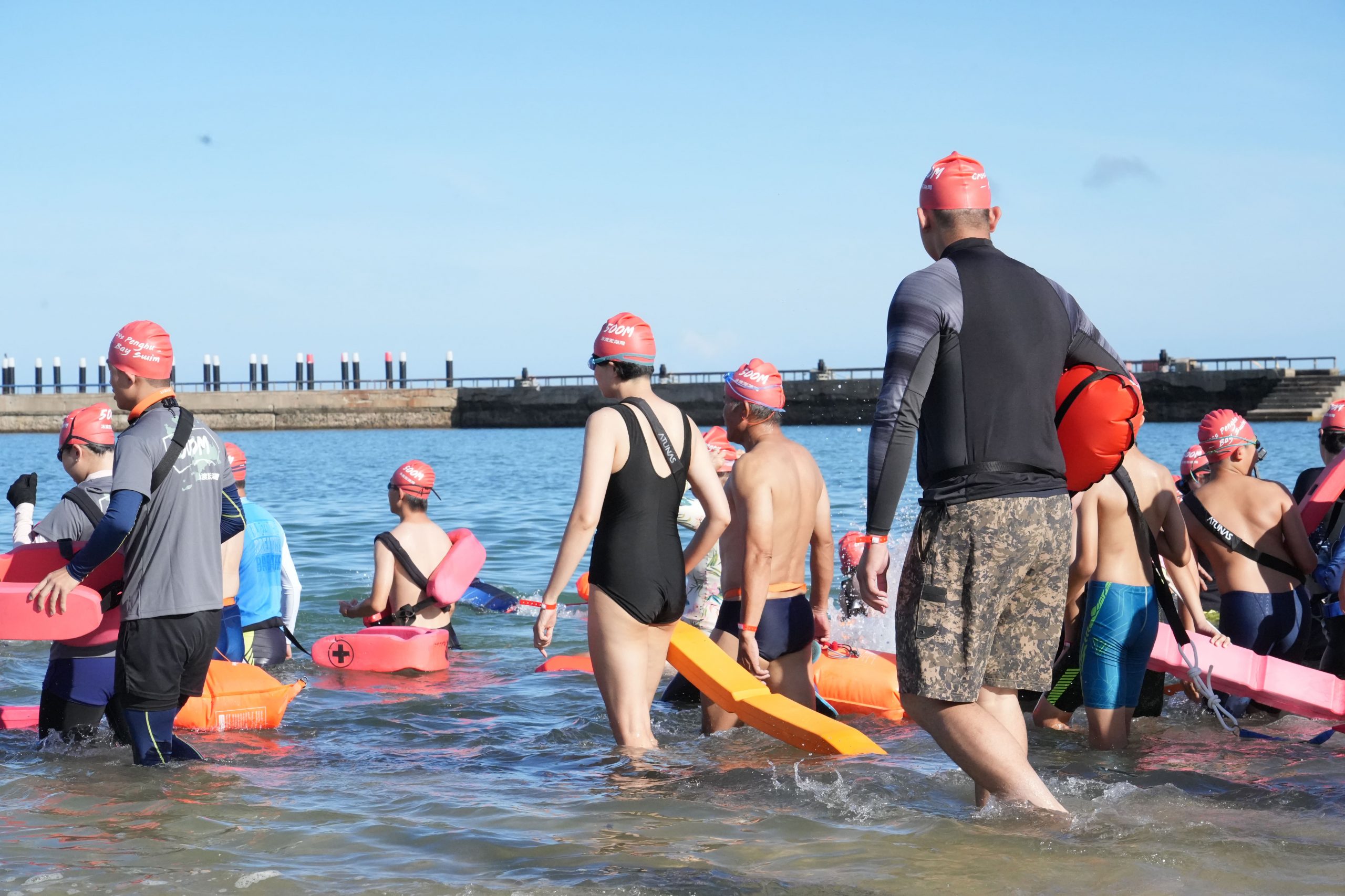 清晨時分,家長牽著孩子、游泳好手與眾多熱愛水域活動的民眾齊聚觀音亭,場面溫馨而熱烈。大家在老師的帶動下熱身、互相加油,展現出澎湖滿滿的活力與熱情。
