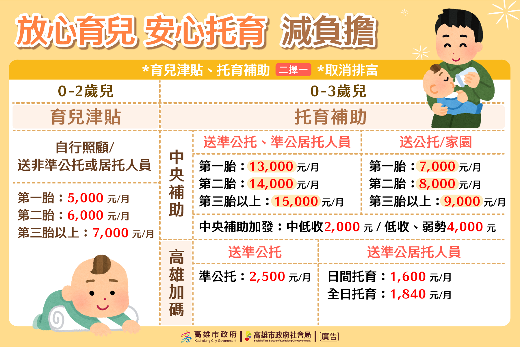 另配合中央0至6歲國家一起養政策,發放育兒津貼及托育補助,家長自行照顧未滿2歲兒童可申領育兒津貼每月5千元。送托公托中心中央公共化托育補助每月7千元。送托準公共居托人員(保母)或托嬰中心,中央補助每月1萬3千元,且已全面推動「線上申請」育兒津貼或托育補助,民眾透過線上在家也可以申請津貼補助喔!高雄市自112年起再加碼準公托育補助,送托準公共保母加碼補助日間托育每月1,600元,中央加高市共計補助每月1萬4,600元;送準公共托嬰中心加碼補助每月2,500元,中央加高市共計補助每月1萬5,500元,實質減輕家長育兒負擔,實踐政府與家庭一起承擔照顧責任的承諾。