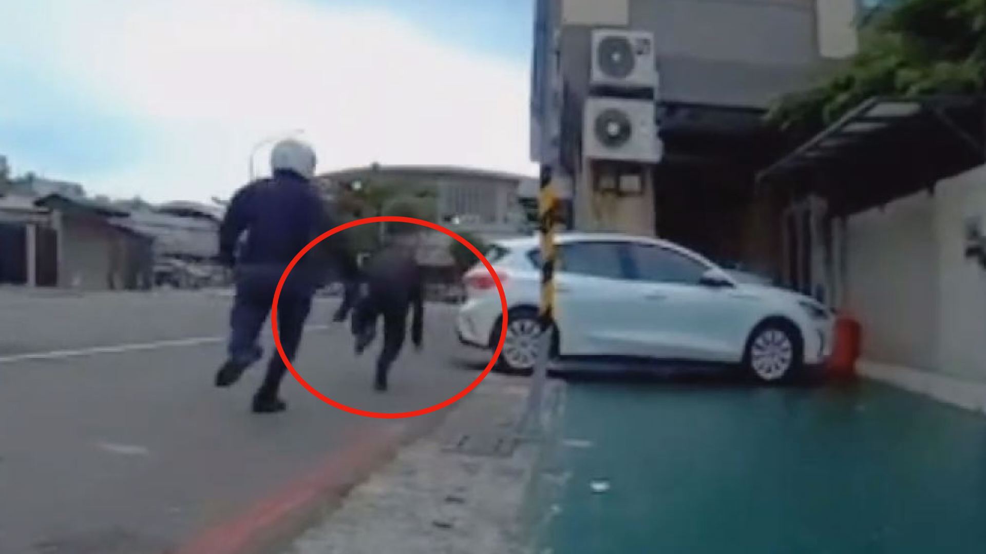 員警在熱心機車騎士協助下,共同追緝逃逸的阮男(紅圈處),阮男緊張而飛趴在地被逮。(記者李佳龍/翻攝)