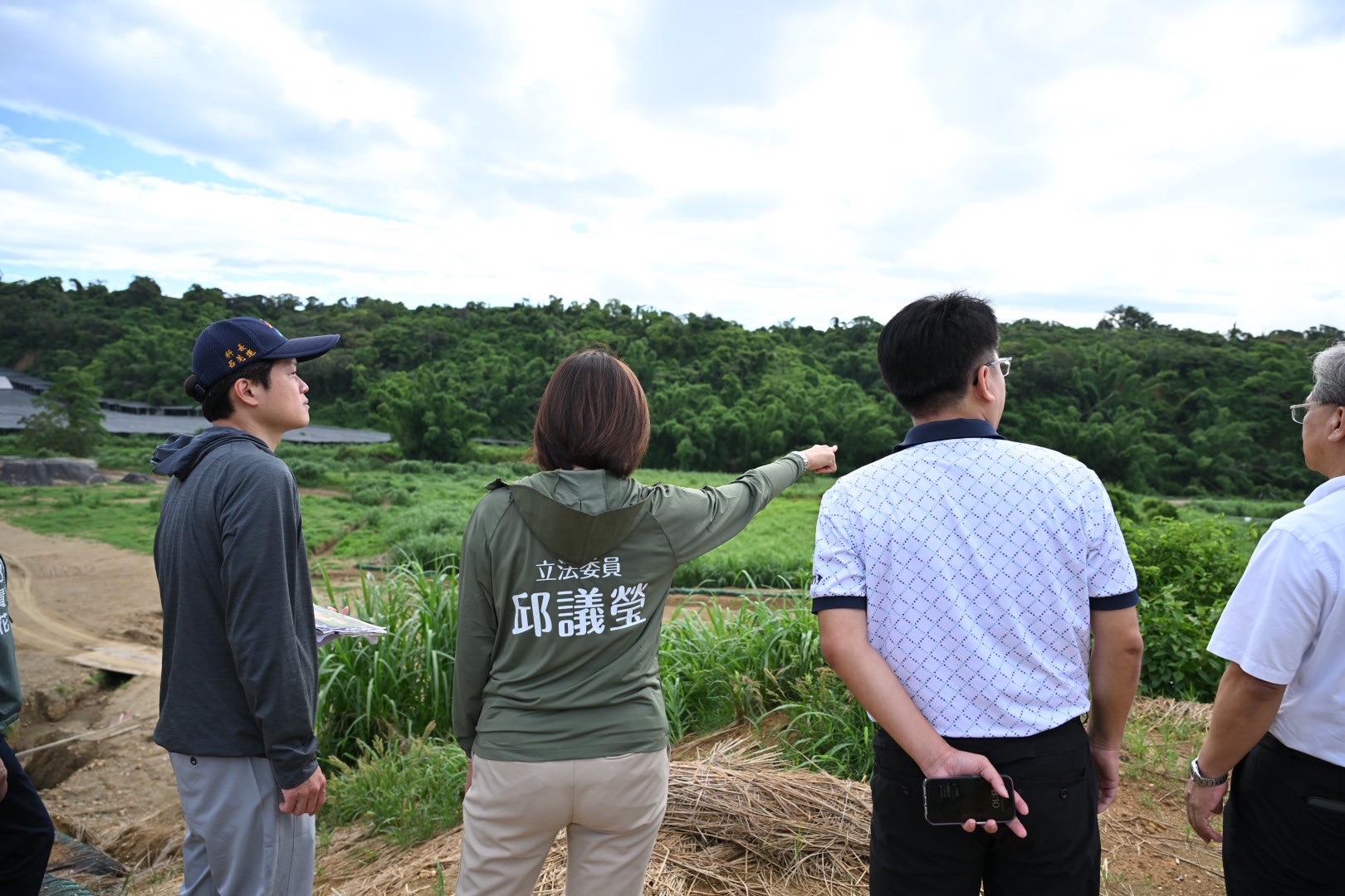 颱風丹娜絲生成,中央氣象署今(5)日上午已發布海上颱風警報。為強化防汛整備,立法委員邱議瑩一早與高雄市政府水利局前往高雄市大樹區勘查和山光電案場周邊地勢與水土保持現況,要求在颱風來襲前即刻全面檢視臨時水路與沉砂設施,做好防汛準備,並加速完成水保工程及植生復原工程,以確保周圍居民的安全。