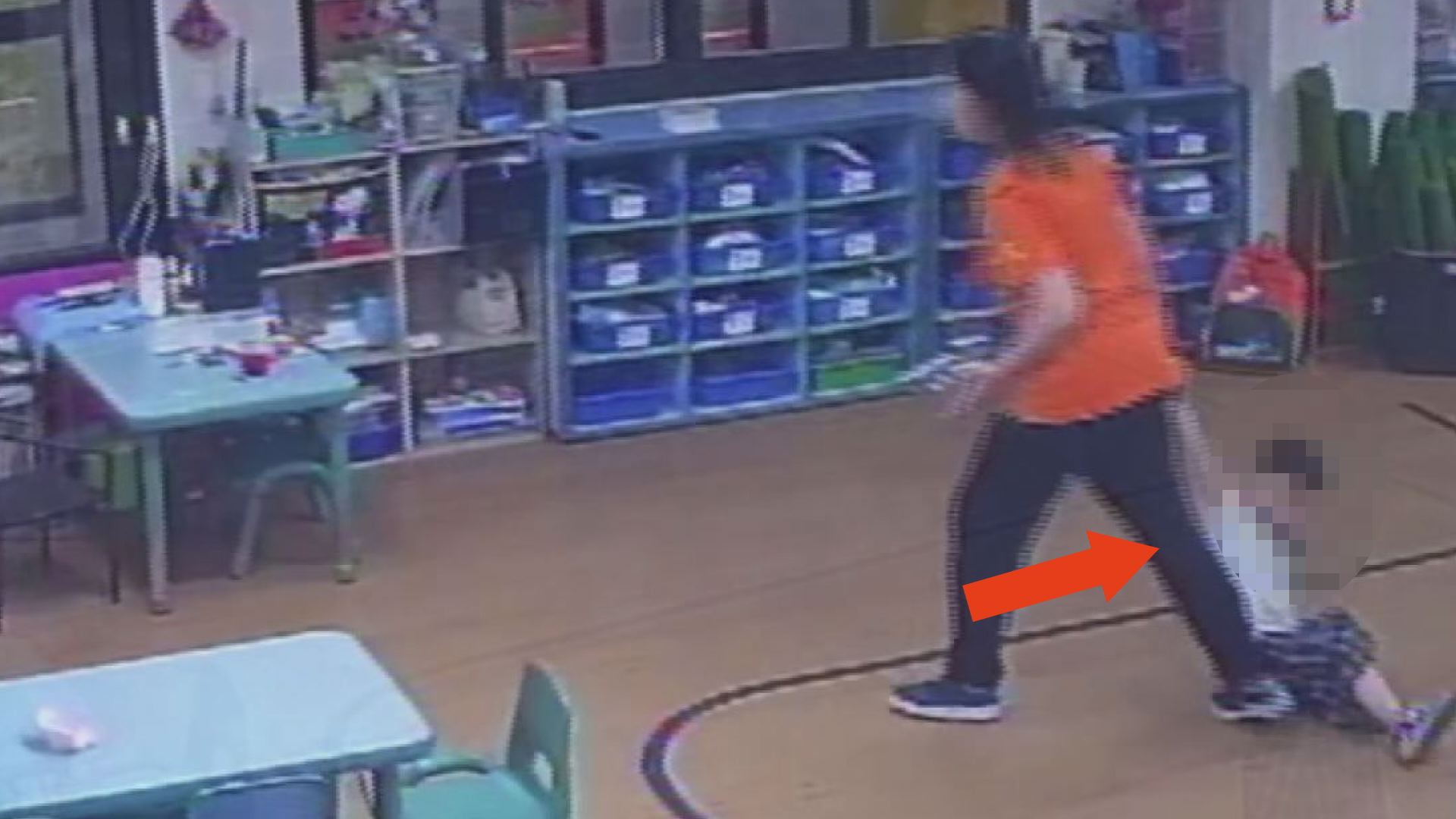 監視畫面拍下,幼兒園蔡姓職員拉扯年幼孩童手臂,並在教室內強行拖行(紅色箭頭處)。不僅可能造成孩童肢體傷害,也對幼童心理造成陰影。(記者李佳龍/翻攝)