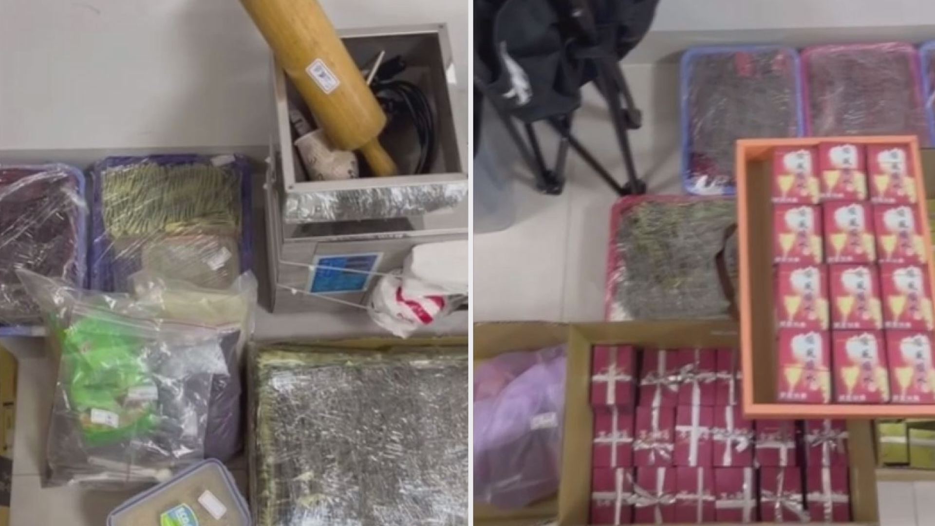 警方查獲毒品分裝工具及成品,包含攪拌器具、分裝機具、大量混合式毒品咖啡包與原料。(記者李佳龍/翻攝)