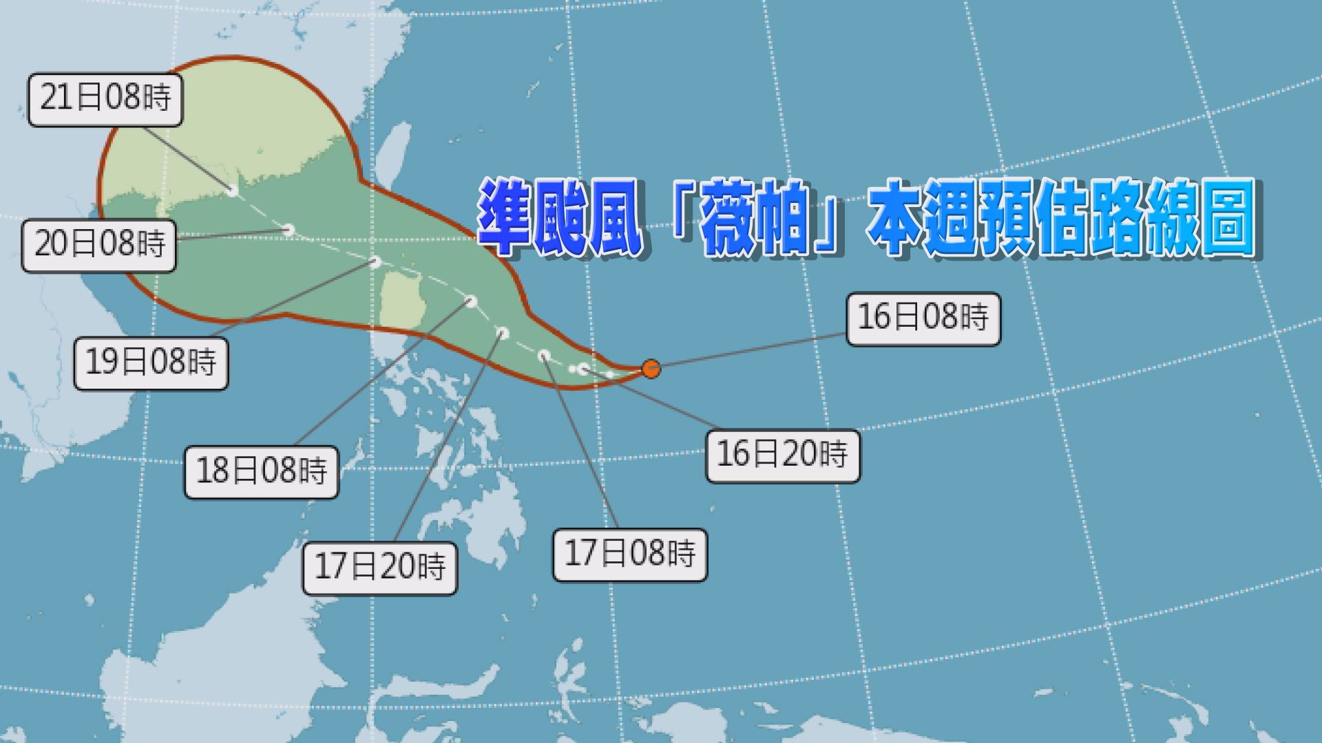 準颱風「薇帕」的本週預估路徑圖,顯示其將朝呂宋島北方至南巴士海峽一帶移動,預估週六最接近台灣南部地區。(圖:記者李佳龍/翻攝中央氣象署)