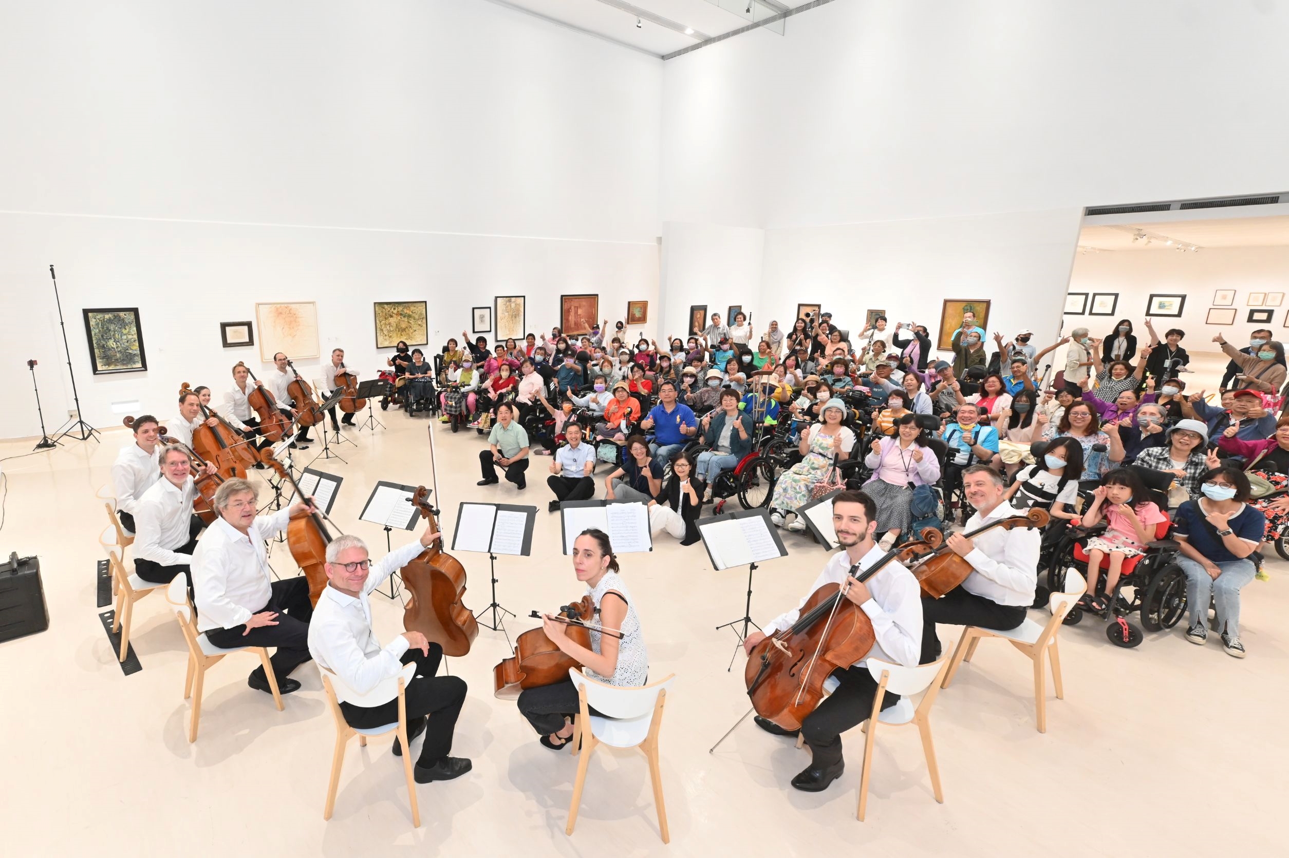 「柏林愛樂12把大提琴」音樂家們與所有在場的貴賓及輪椅族朋友們合影。(記者翻攝) (圖中間區域由左至右為張正傑老師、中鋼基金會黃一中執行長、高美館代理館長林羿妏與高雄市社會局葉欣雅副局長)
