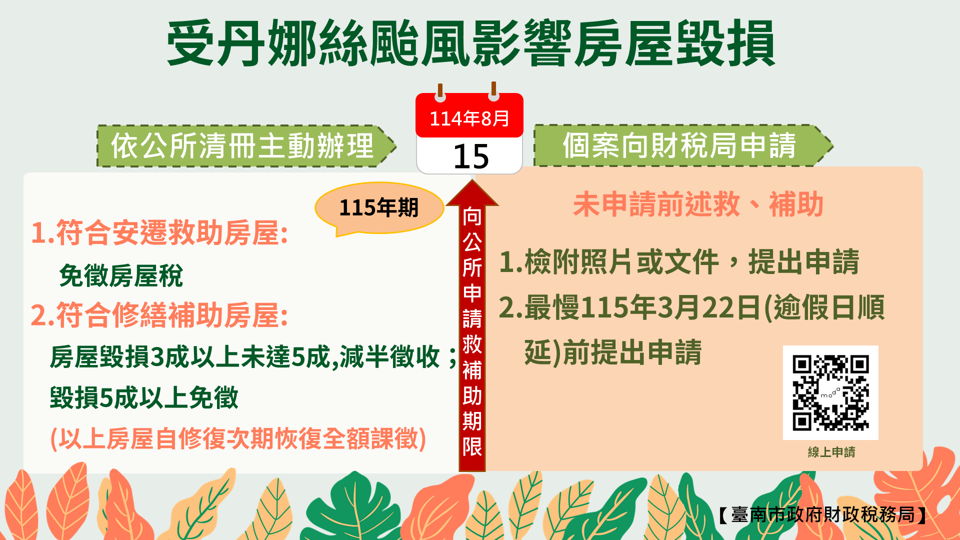 【記者蘇品軒/臺南報導】臺南市政府財政稅務局表示,丹娜絲颱風侵襲,多處房屋因風災受損,房屋受有損害的市民朋友,於今(114)年8月15日前請逕向區公所申請安遷救助或修繕補助,財稅局將秉持從簡、從寬、從優原則,依區公所提供之安遷救助及修繕補助清冊,主動辦理房屋稅減免。