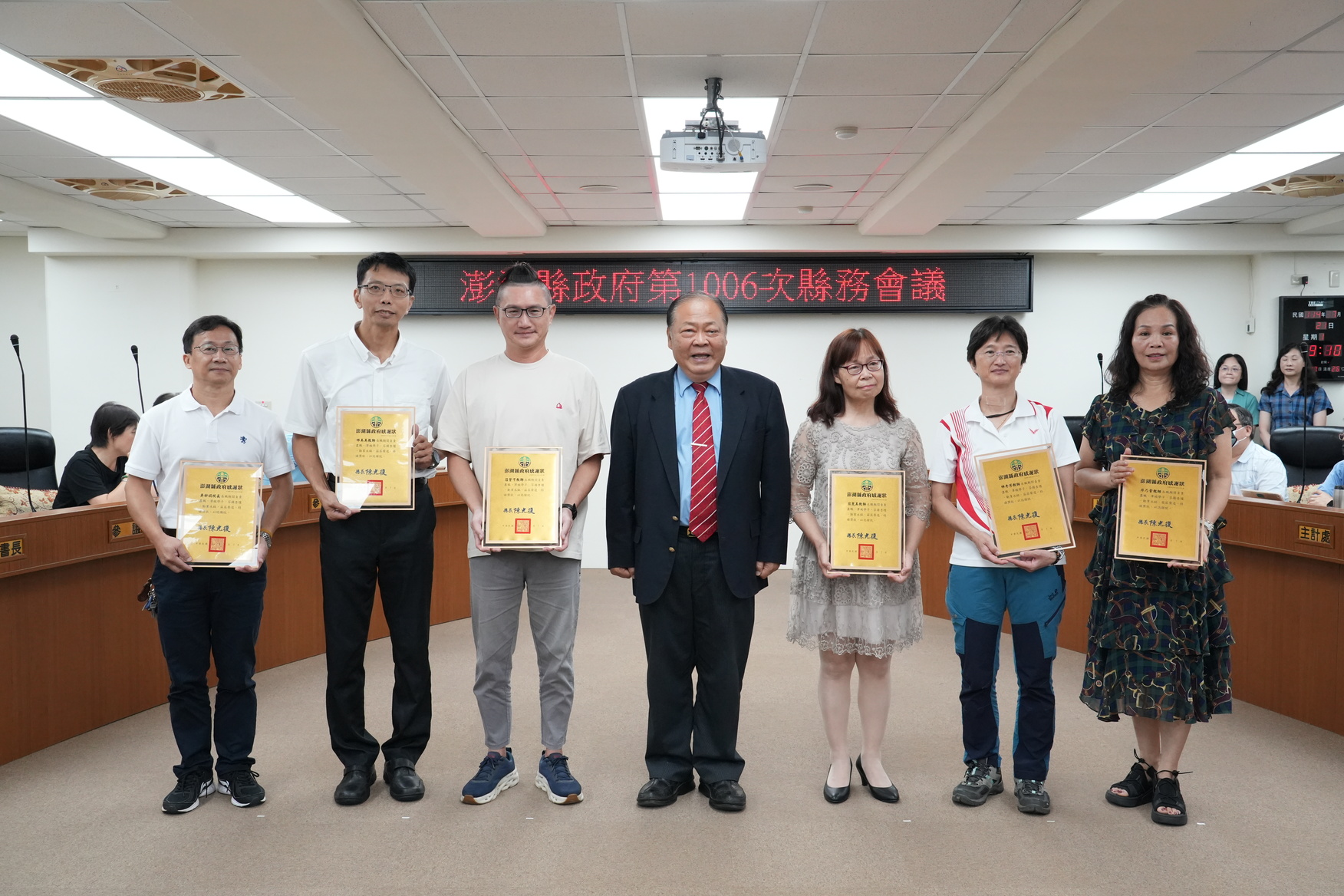 澎湖縣長陳光復21日上午主持縣府第1006次縣務會議,並於會中表揚國中小退休教師與護理師、阻攔詐騙有功人員,以及在為民服務、採購稽核、工程施工查核、長照業務推動,與農漁考核等領域表現傑出的績優團隊,肯定大家為社會、縣政所付出的心力與貢獻。