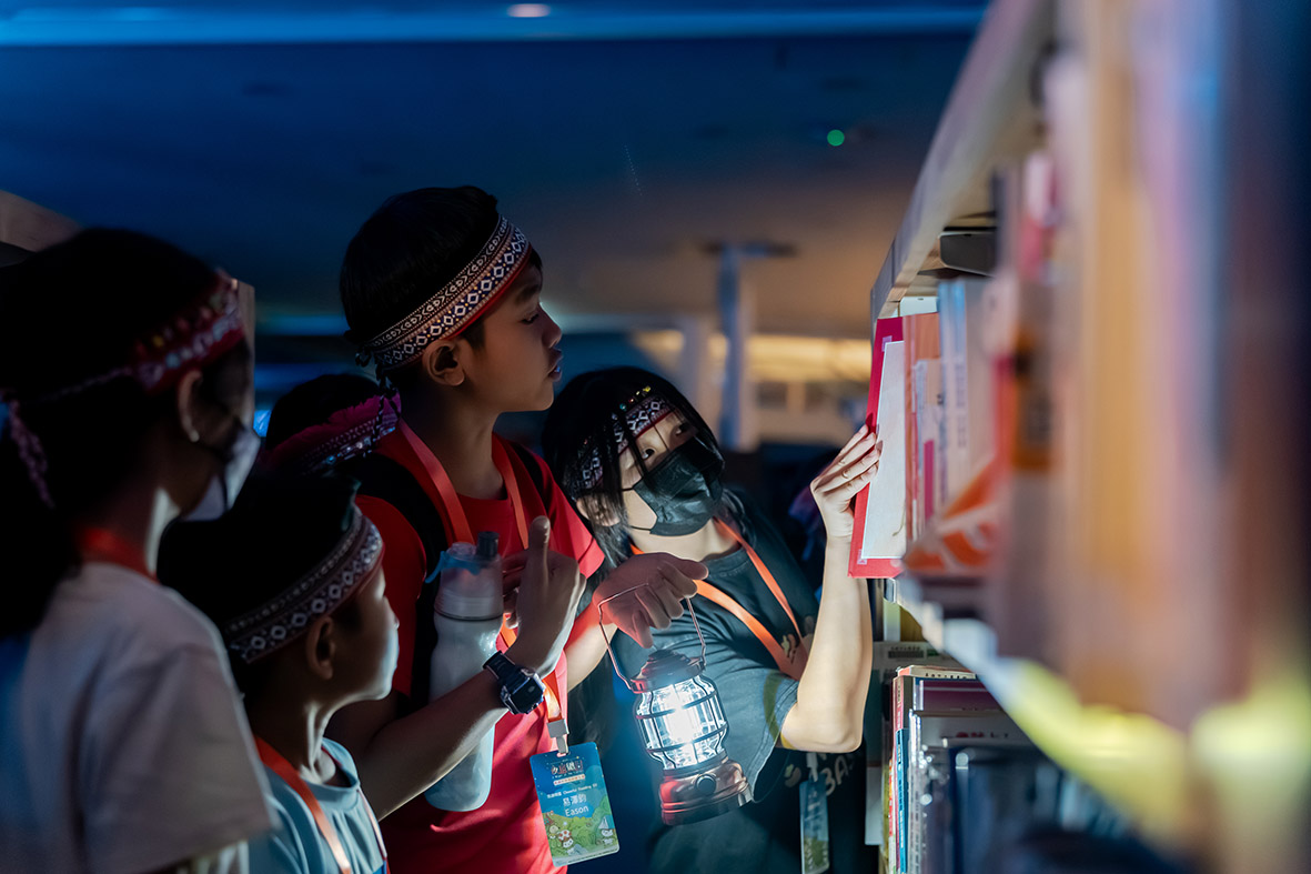 孩子們拿著手電筒夜遊圖書館,一邊學習索書號,一邊找尋藏書線索,展現團隊合作與默契。