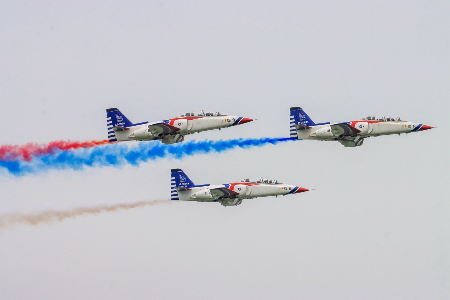 空軍上午舉行雷虎小組傳承交接典禮暨A J T勇鷹高教機噴煙性能展示,未來將由A J T型機的勇鷹高教機進行展演任務。(蔡明航/攝)
