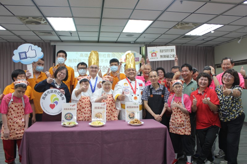 【記者陳春生/高雄報導】社會局無障礙之家伙食委外廠商大主廚黃勝賓榮獲衛福部頒發有「廚師界金馬獎」之稱的「金帽獎」,無障礙之家為促進憨兒興趣發展與豐富感官經驗,特別於今(7)日舉辦「大主廚小跟班的幸福食光」手作料理活動。社會局長蔡宛芬挽起袖子與5位小跟班在大主廚的指導下,一同剝菜、打蛋、裹粉、擺盤,共同完成和風生菜沙拉、蝦仁滑蛋及椒鹽鹹酥雞等三道家常料理,當天興邦里薛文龍里長及社區幸福學堂長者參與同樂,現場洋溢著歡笑與感動。