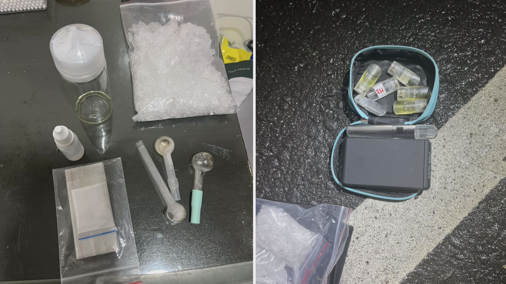 警方現場查扣多樣毒品,包括安非他命、依托咪酯煙油及分裝工具等。(圖:記者李佳龍/翻攝)