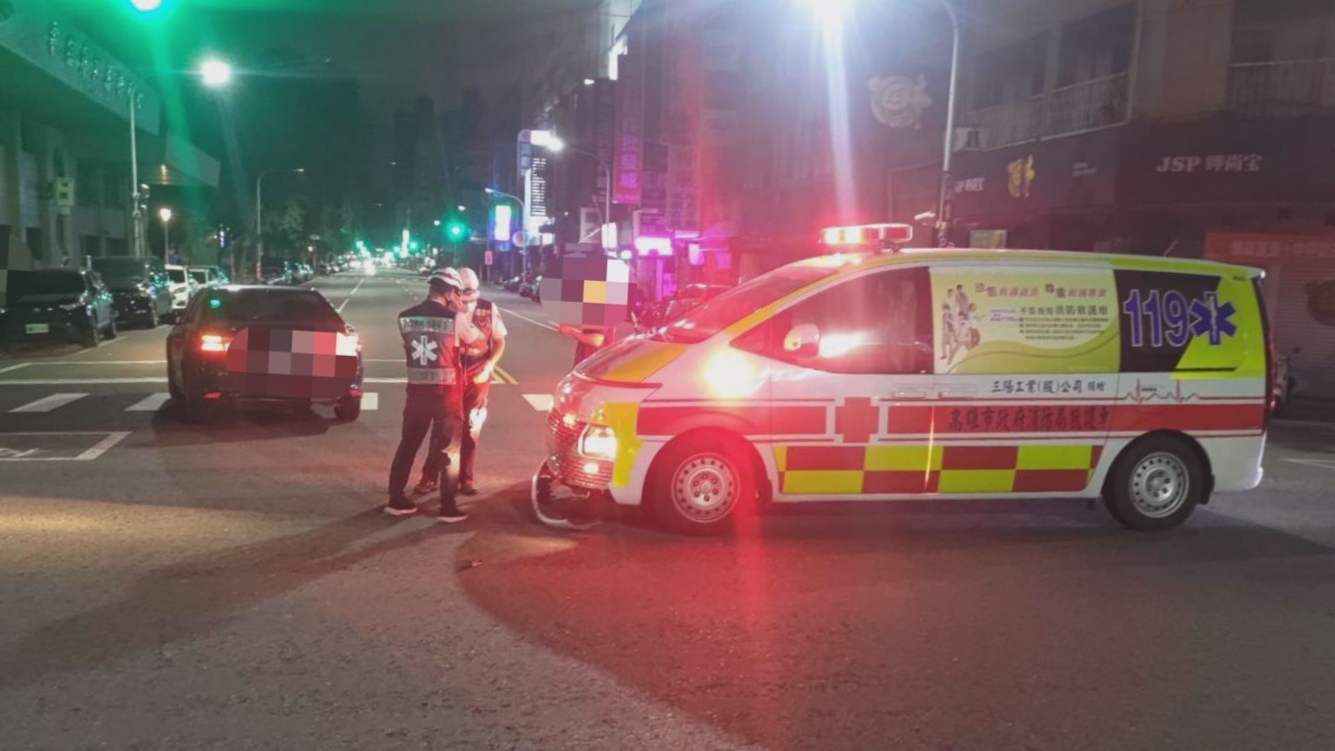 救護車與自小客車在路口發生碰撞後,警消人員正確保救護車後送病患行動不受影響。(圖:記者李佳龍/翻攝)