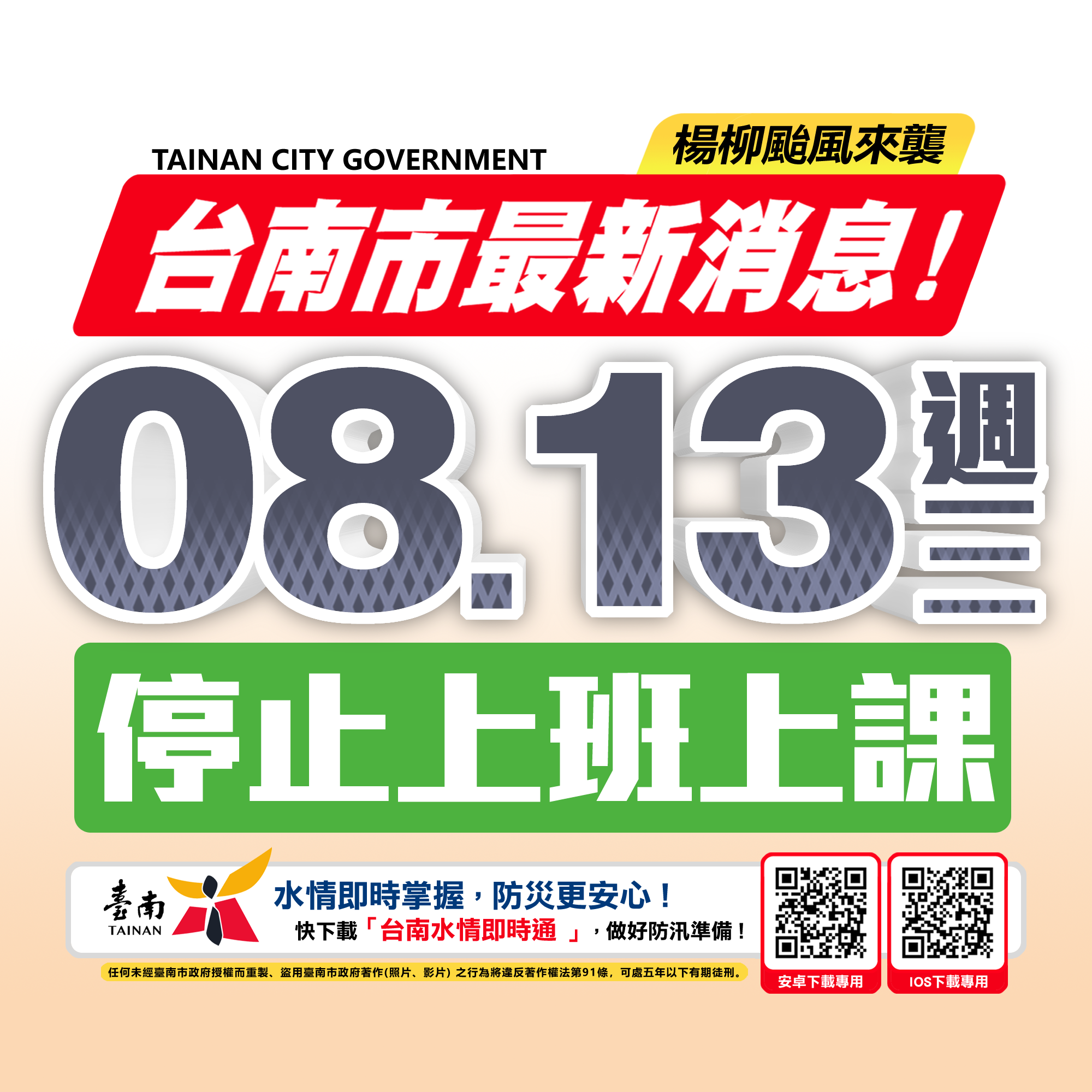 【記者林芸/臺南報導】中度颱風楊柳颱風警報,根據中央氣象署資訊發布陸上強風特報,颱風及其外圍環流,明(13)日晨至13日晚上,台南市有平均風9級以上或陣風11級以上發生的機率,考量風力有危及市民上班上課安全或有致災之虞,為維護民眾安全及各項整備應變作為,臺南市政府8/12日晚上宣布,明(8/13)日停止上班、停止上課。