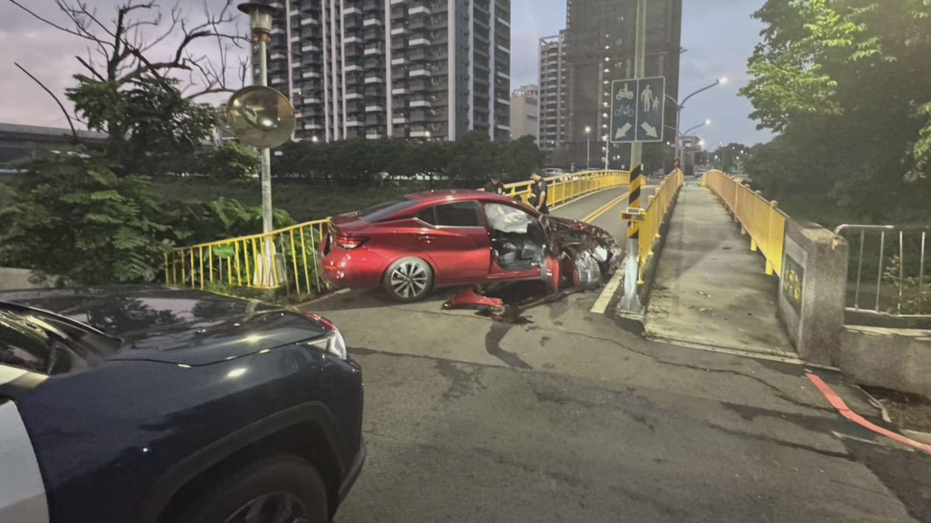 拒檢車輛在楠梓區高楠公路惠豐橋上自撞燈桿,車頭嚴重毀損。(圖:記者李佳龍/翻攝)