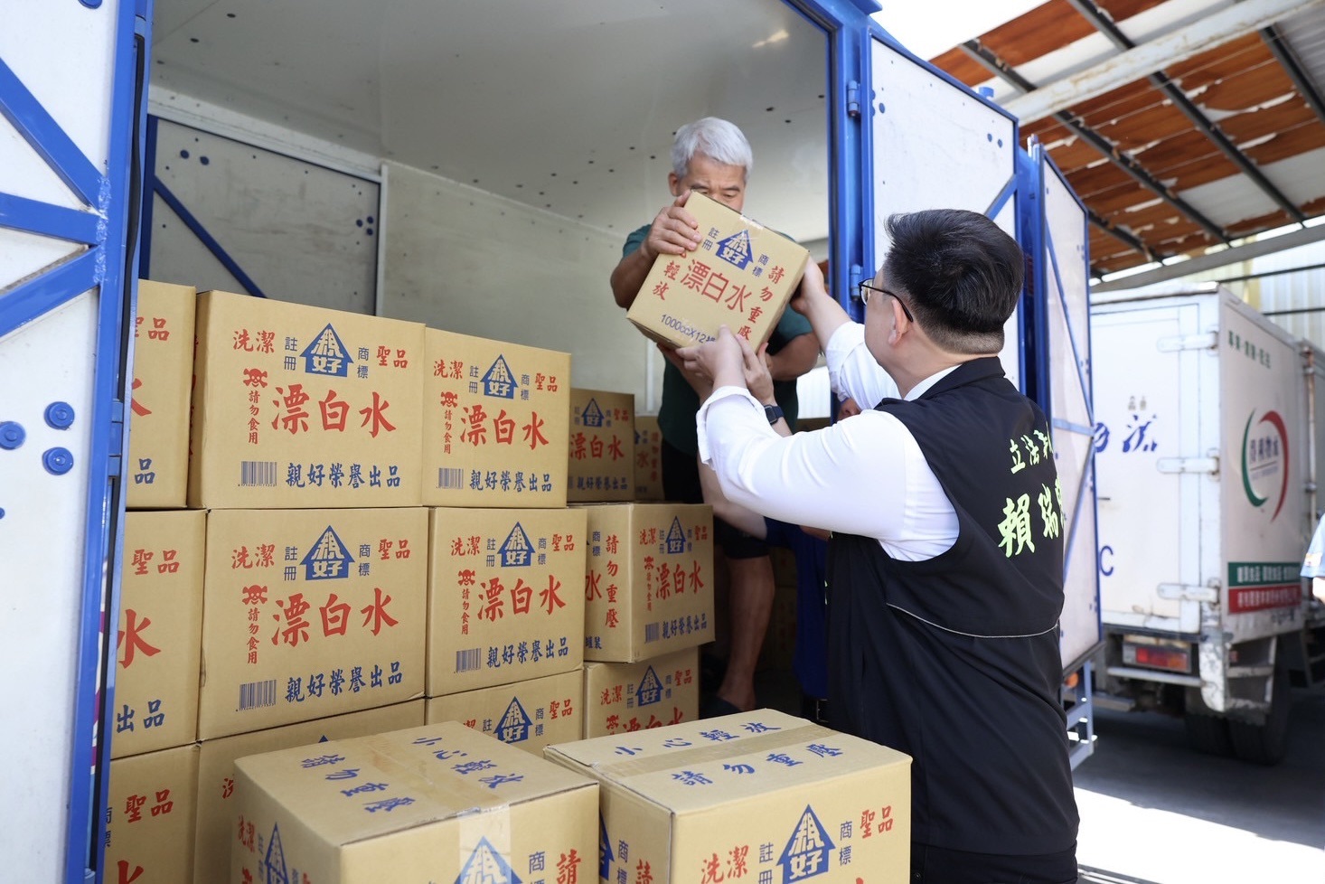 立委賴瑞隆攜手高雄中山扶輪社伍英杰社長,將200箱漂白水運往台南新營,交由立委賴惠員服務處調配發送。(記者翻攝)