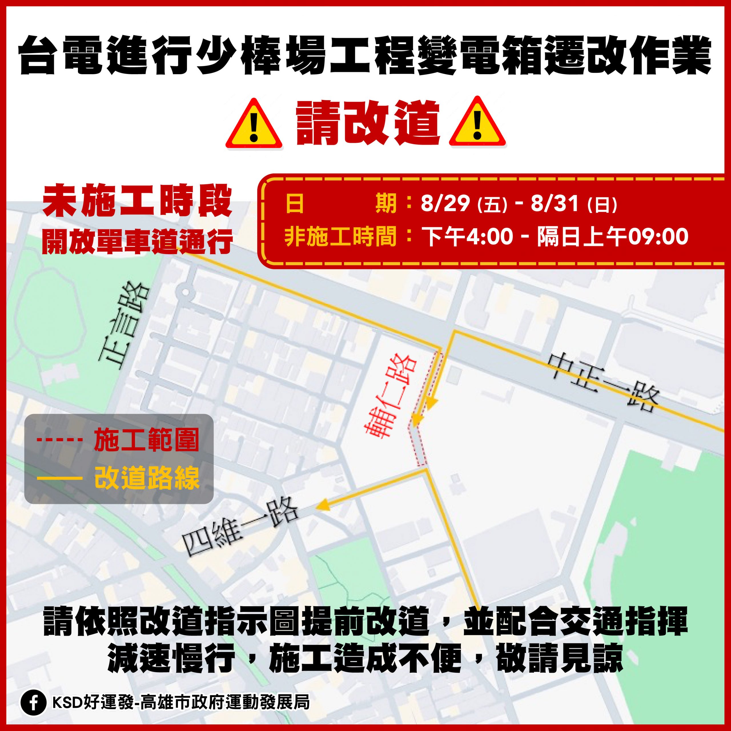 【記者陳春寶/高雄報導】苓雅區輔仁路於114年8月29日(五)至8月31日(日) 上午9點至下午4點進行挖埋管線作業,屆時將封閉輔仁路(中正一路至四維一路間)雙向車道,四維一路前往武廟路需改由正言路、福德路行駛,請用路人提早改道,以節省行車時間。