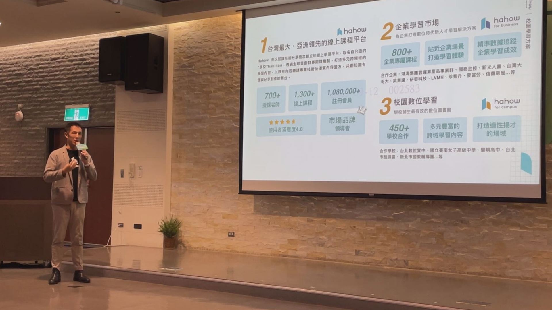 Hahow好學校共同創辦人暨執行長江前緯,介紹數位學習拉近城鄉教育平權以及減碳成果。(圖:記者李佳龍/攝)