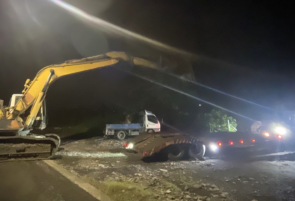警巡邏在美濃成功段農地發現拖板車意圖將挖土機運走,通報環保局查扣2輛怪手並將涉案人帶回偵辦。 (劉昱彣攝)