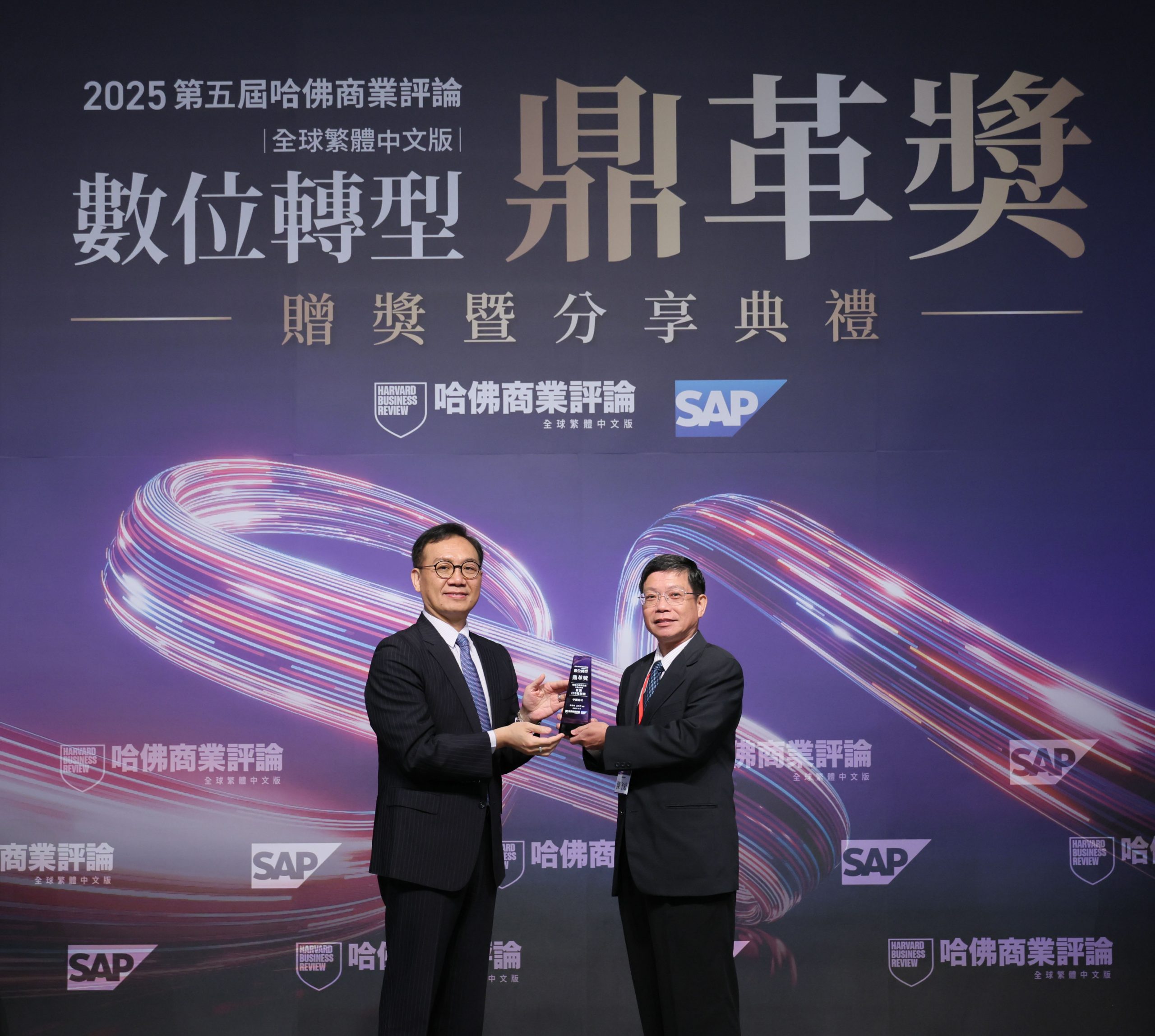 中鋼以「煉鐵燒結智慧再造」專案蟬聯第五屆《哈佛商業評論》「數位轉型鼎革獎」,由總經理陳守道(右)代表公司接受SAP全球副總裁暨台灣總經理陳志惟(左)頒獎。(中鋼提供)