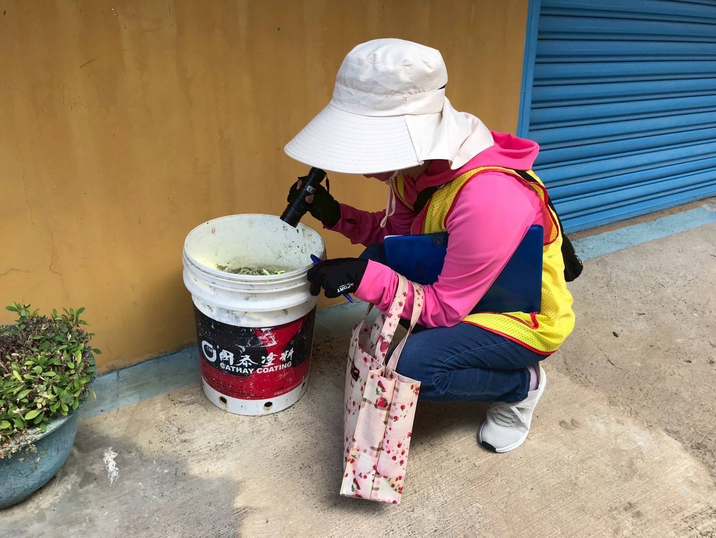 登革熱防治人員社區環境病媒蚊巡查、監測、掃蚊。(記者翻攝)