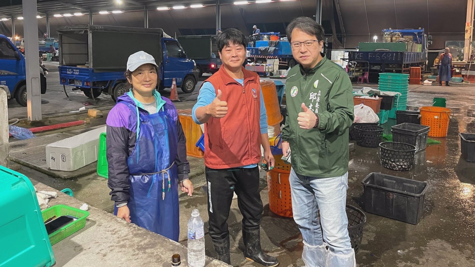 立委邱志偉向市場漁民表示(圖右一),新增製冰主機工程預計將在今年底前完工,滿足農曆年節等重要節日的漁獲保鮮需求。(圖:記者李佳龍/翻攝)