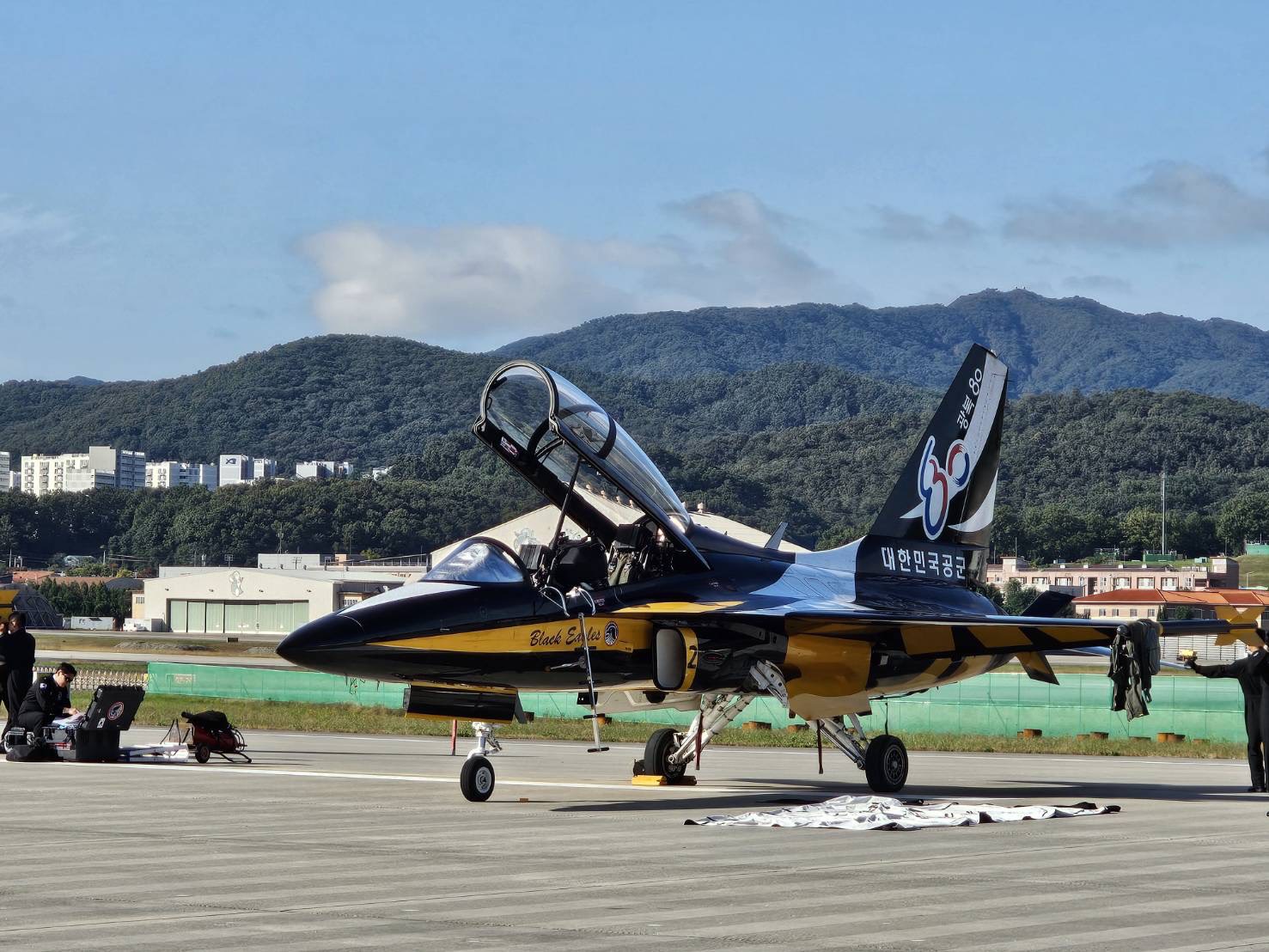 本次公眾日活動內容多元,包含軍用運輸機登艙體驗、虛擬實境(VR)與飛行模擬訓練、太空定向障礙體驗、無人機操控、特技跳傘與儀隊表演等二十餘項互動節目。展區同時展示多型現役戰機與飛彈裝備,其中韓國自製的F/A-50輕型攻擊機、KF-21「獵鷹」原型戰機及黑鷹特技飛行隊的空中表演最受矚目。由韓國主導、印尼共同研發的KF-21戰機雖尚未正式服役,但自2022年7月首飛以來測試進展穩定。此次航展中,KF-21進行動態飛行表演,完成多項高難度動作,展現優異的機動性能。韓國空軍計畫至2032年底部署120架KF-21,印尼則預計採購50架量產機。現場司儀指出,KF-21將取代F-5與已除役的F-4戰機,成為韓國下一代主力機型。