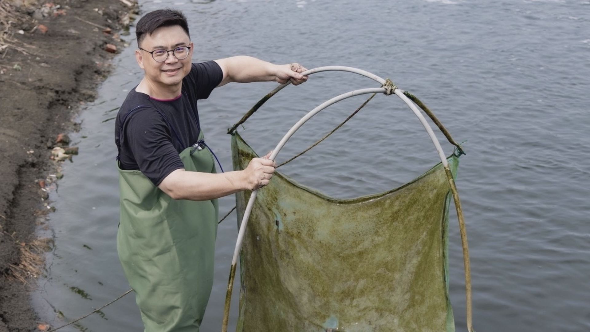 民進黨高雄市長初選候選人、立法委員賴瑞隆穿上防水褲,走入彌陀魚塭體驗捕撈虱目魚,強調親身了解基層需求才能制定務實政策。(圖:記者李佳龍/翻攝)